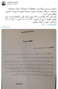 «نتایج بررسی صلاحیت داوطلبان انتخابات میان‌ دوره‌ای مجلس خبرگان رهبری (دوره پنجم) امروز به وزارت کشور اعلام می‌گردد. کسانی که صلاحیت آنان مورد تایید قرار نگرفته است می توانند ظرف ۳ روز از تاریخ ۱۴۰۰/۰۲/۳۰ الی ۱۴۰۰/۰۳/۰۱ شکایت خود را ارائه نمایند».