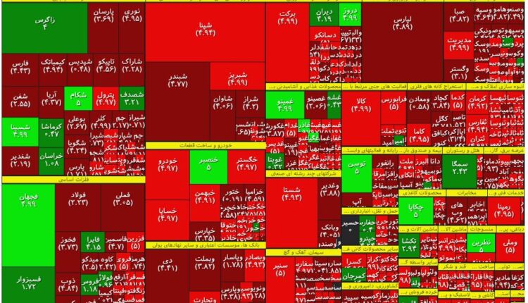 امروز قیمت سهام تمامی نمادهای گروههای «بانکها و موسسات اعتباری» (از جمله وبملت، دی، وپاسار، وتجارت، وبصادر، وپارس، وملل، وسینا، وپست، وکار، وخاور و ونوین)، «فراوردههای نفتی، کک و سوخت هستهای» (از جمله شپنا، شبریز، ونفت، شپاس، شبندر، شاوان، شراز، شسپا، شرانل و شبهرن)، «شرکتهای چندرشتهای صنعتی» (از جمله شستا، وغدیر، وبانک و وصندوق)، «سیمان، آهک و گچ» (از جمله سنیر، سفارس، سمازن، ستران، سدور، سخاش، سفار، سفانو، سخزر، سبزوا، سغرب و سیلام)، «استخراج کانههای فلزی» (کدما، کاما، کچاد، ومعادن، کگل، تاصیکو، اپال و کگهر)، «انبوهسازی، املاک و مستغلات» (از جمله ثفارس، کرمان، ثتران، ثنوسا، ثبهساز، وساخت و ثاخت) و «مخابرات» (از جمله اخابر، همراه، های وب، اوان و اپرداز) کاهش یافت و یکپارچه قرمزپوش شدند.